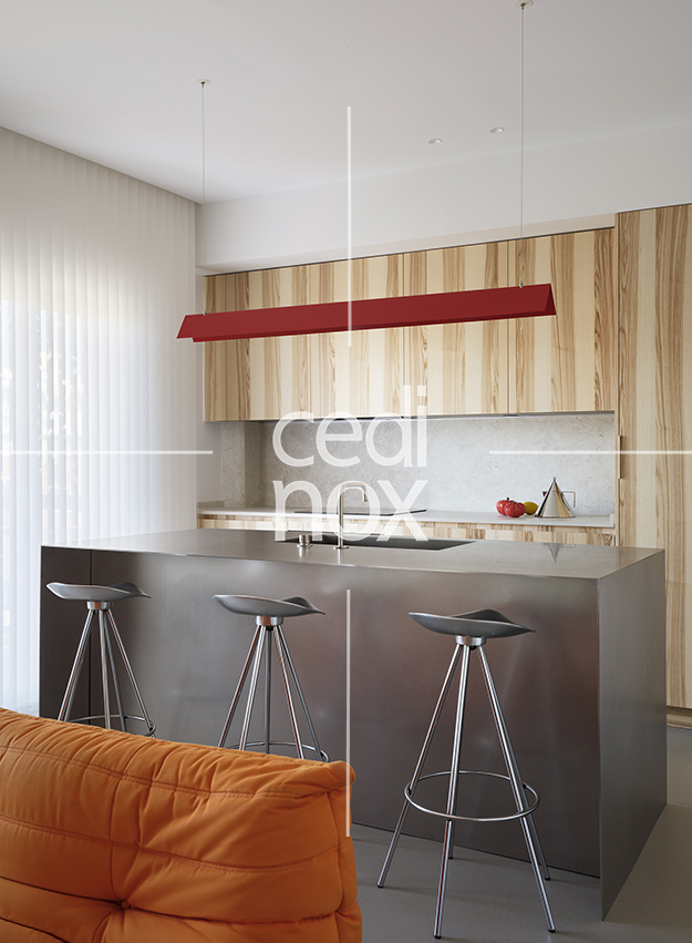 Linóleo, yeso original y acero inoxidable coexisten armoniosamente en este diseño. La paleta de color juega con blancos, negros, grises y madera, pero añade vitalidad con toques vibrantes, como el tono naranja del icónico sofá Togo de Michel Ducaroy para Ligne Roset y el rojo de la gran lámpara lineal suspendida sobre la isla de la cocina. Es justo esta pieza, la isla central de la cocina, la que materializa el acero inoxidable. Se opta por una chapa gruesa de 5 mm de espesor combinada con un frontal de fresno natural.