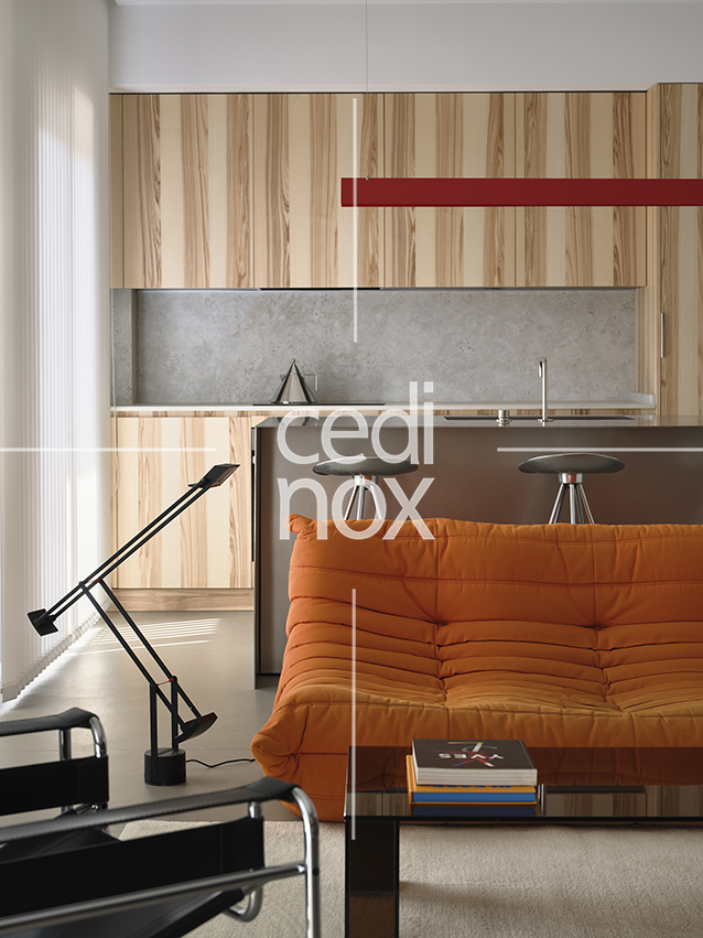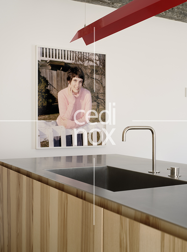 Linóleo, yeso original y acero inoxidable coexisten armoniosamente en este diseño. La paleta de color juega con blancos, negros, grises y madera, pero añade vitalidad con toques vibrantes, como el tono naranja del icónico sofá Togo de Michel Ducaroy para Ligne Roset y el rojo de la gran lámpara lineal suspendida sobre la isla de la cocina. Es justo esta pieza, la isla central de la cocina, la que materializa el acero inoxidable. Se opta por una chapa gruesa de 5 mm de espesor combinada con un frontal de fresno natural.