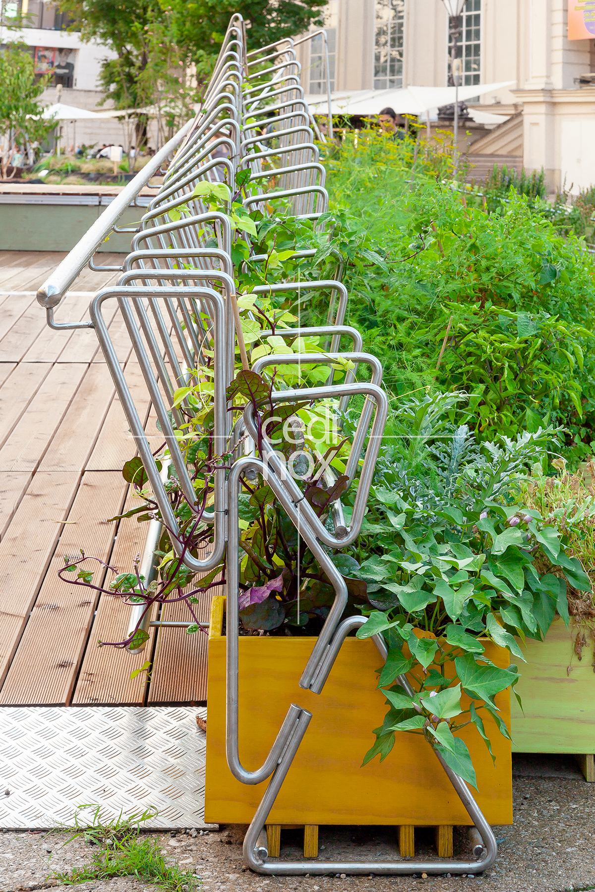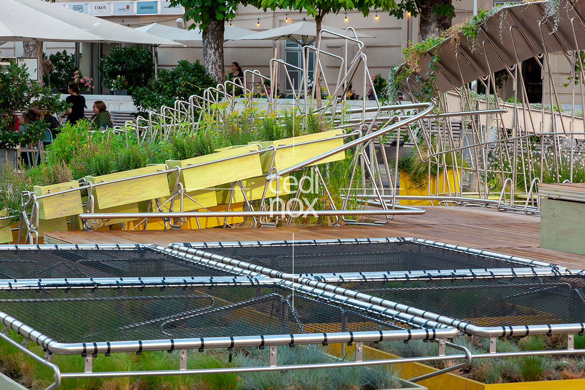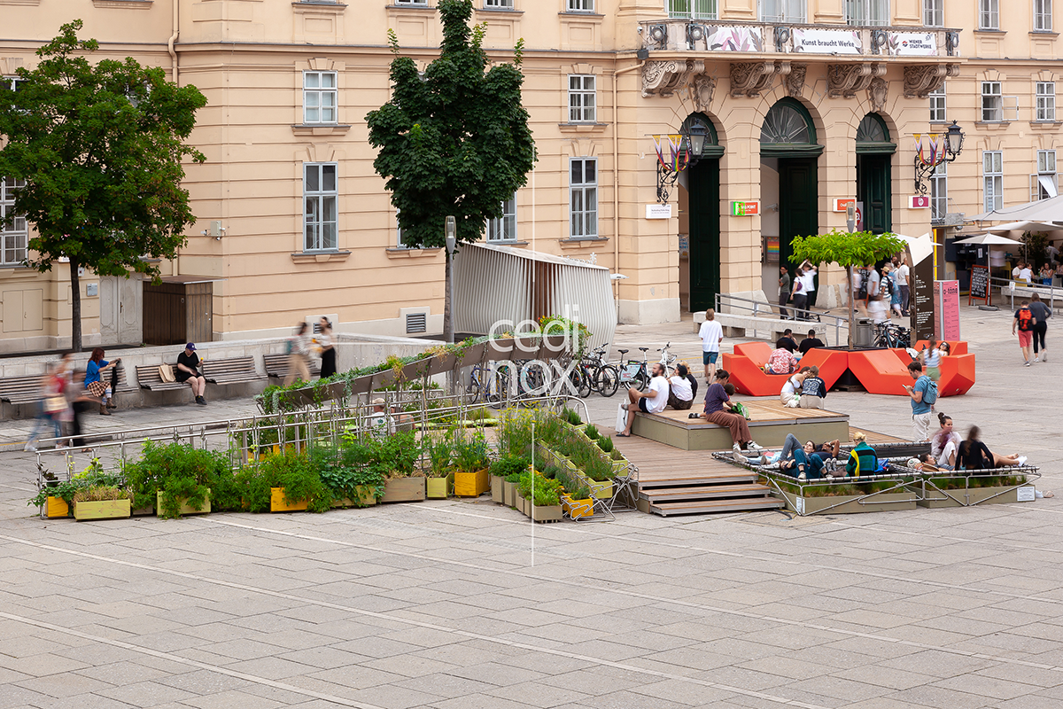 En este contexto arquitectónico nace una isla urbana inclusiva, diseñada para transformar una zona de tránsito en un entorno acogedor. Es un escenario dinámico concebido para fomentar la coexistencia de diversas actividades y participantes, promoviendo experiencias compartidas y redefiniendo el urbanismo convencional. El escenario lo componen tres zonas bien diferenciadas: un huerto urbano que invita a la participación pública, donde crecen frutas y verduras; una pradera donde las hierbas altas evocan un pequeño oasis de naturaleza dentro del denso entorno urbano; y un escenario íntimo que facilita diálogos y actuaciones espontáneas.