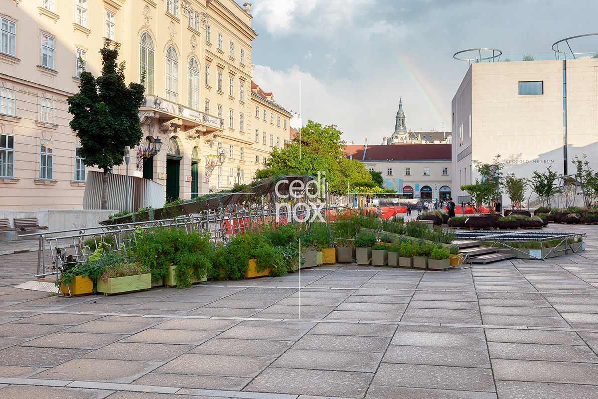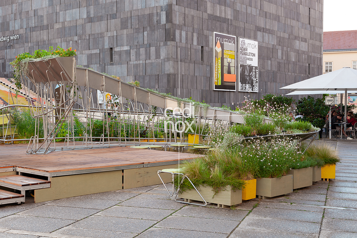 El MQ, “Barrio de los Museos”, tiene una extensión 90.000 m2 en el corazón de Viena y acoge 60 instituciones culturales. Es uno de los mayores distritos en el mundo dedicado íntegramente al arte contemporáneo y la cultura. En el MQ no existen fronteras: la arquitectura histórica converge con el diseño contemporáneo. Es, ante todo, un lugar de encuentro cuya entrada no tiene barreras y permanece abierta las 24 horas. Con el objetivo de ser climáticamente neutros para el año 2030, se han implementado tres medidas principales: la revegetación del terreno, la gestión respetuosa con los recursos y un proyecto artístico centrado en el medio ambiente y la sostenibilidad.