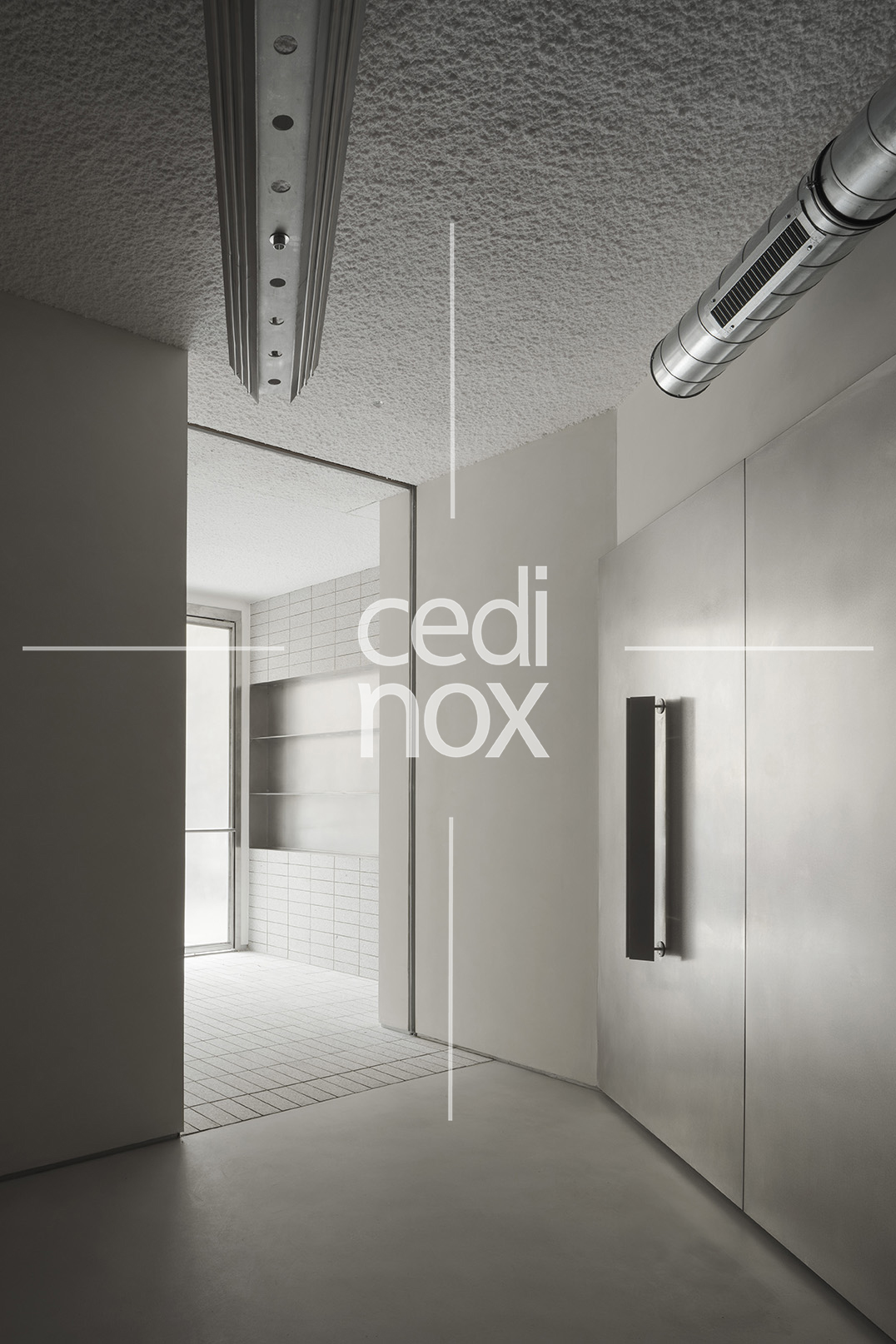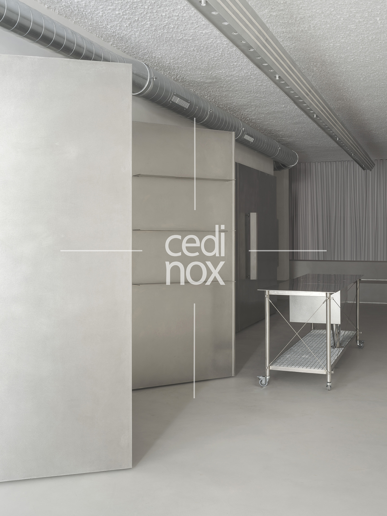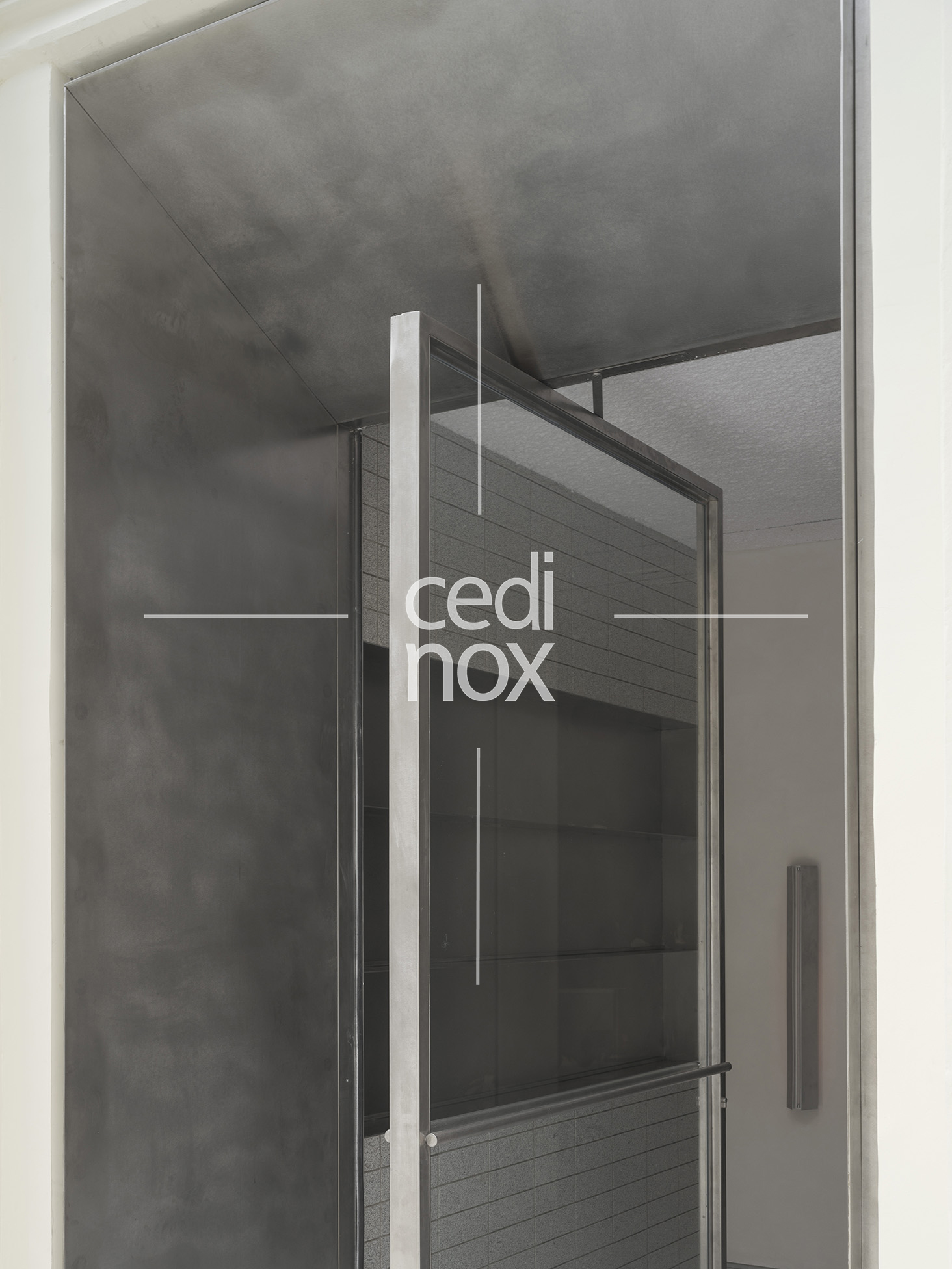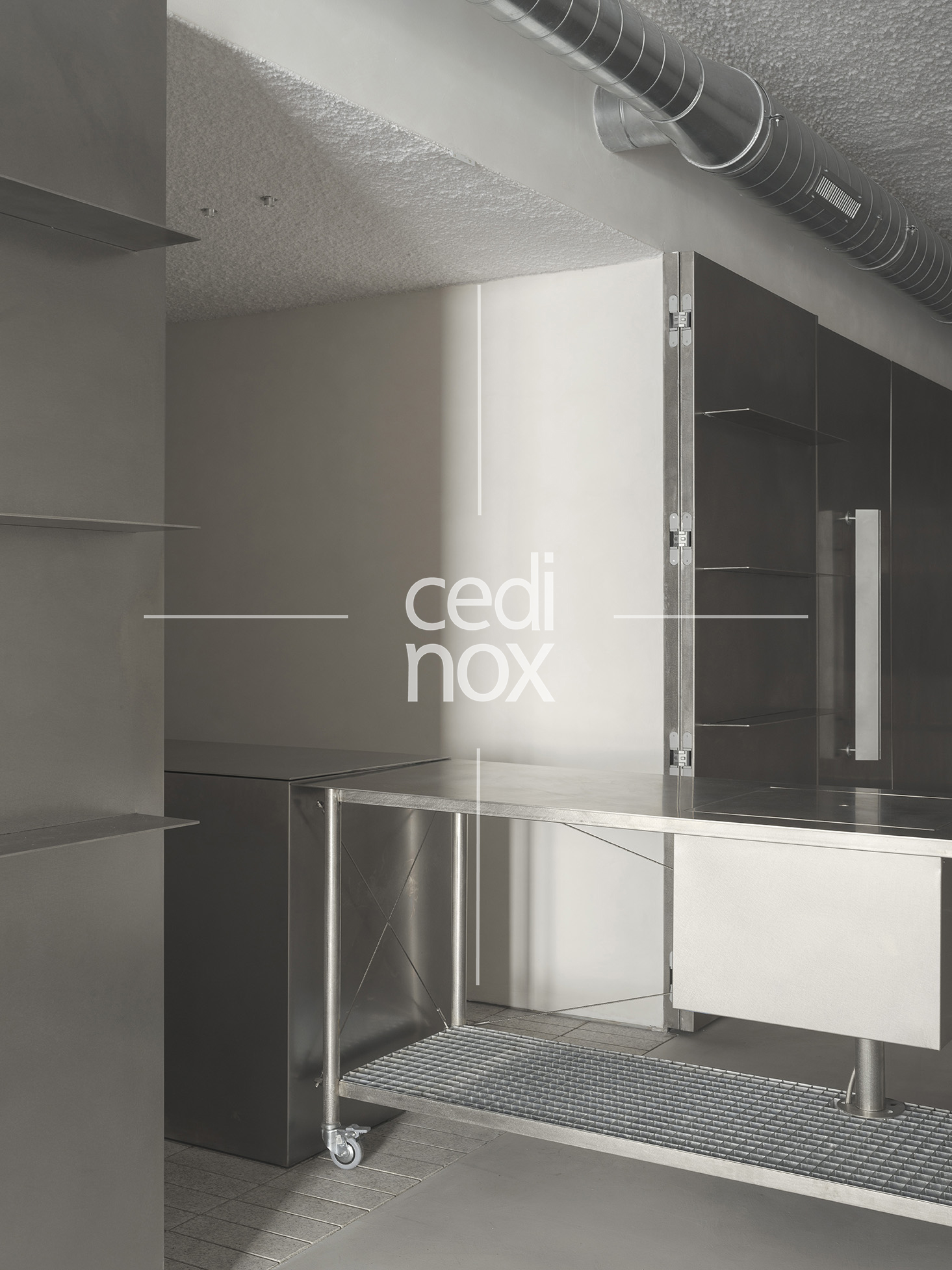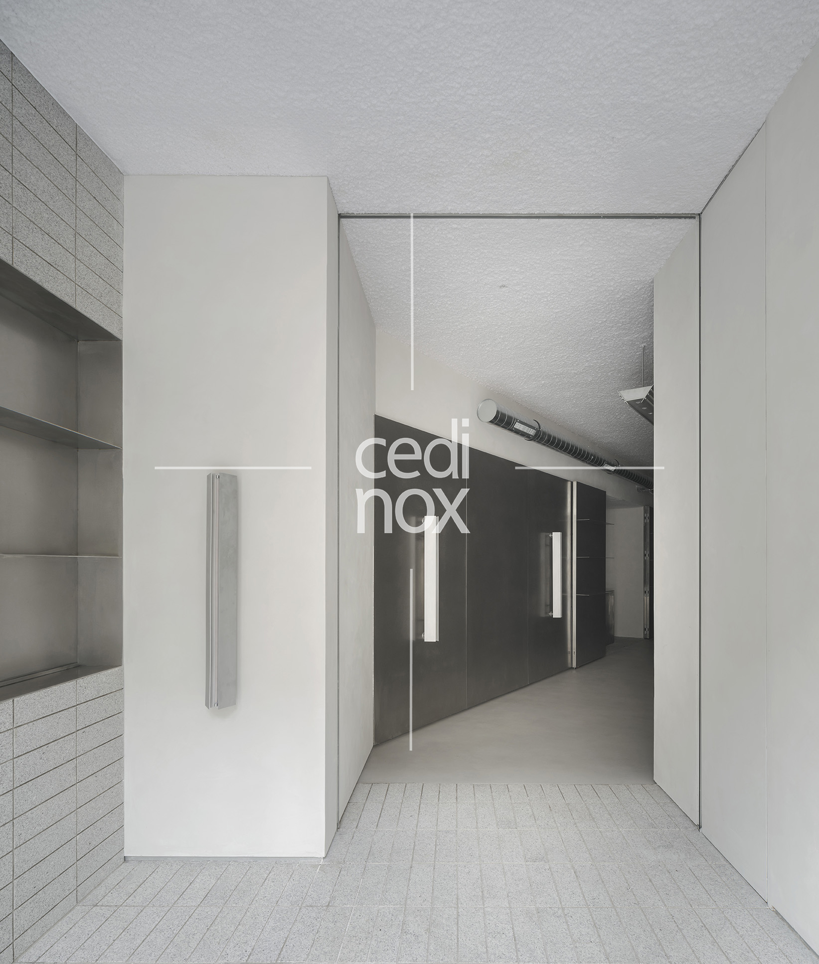 El acero inoxidable tiene una gran responsabilidad, además de darnos el acceso a través de la monumental puerta, es el mecanismo que activa la versatilidad del proyecto. Se manifiesta a través del imponente revestimiento metálico que domina uno de los flancos de la sala. Este plano continuo no es sólo un acabado estético de gran potencia visual; es una superficie móvil que custodia el programa funcional, la cocina y espacio de preparación. Los paneles están formados por tablero de DM revestido con acero inoxidable en acabado vibrado de 1,5 mm de espesor.