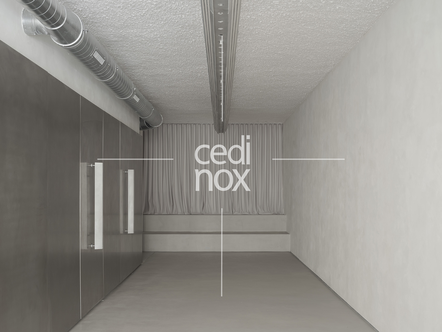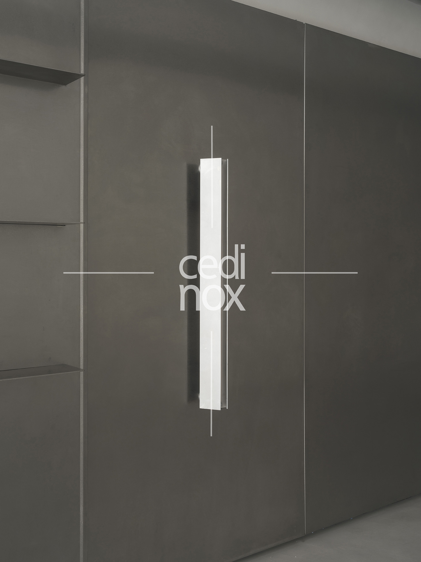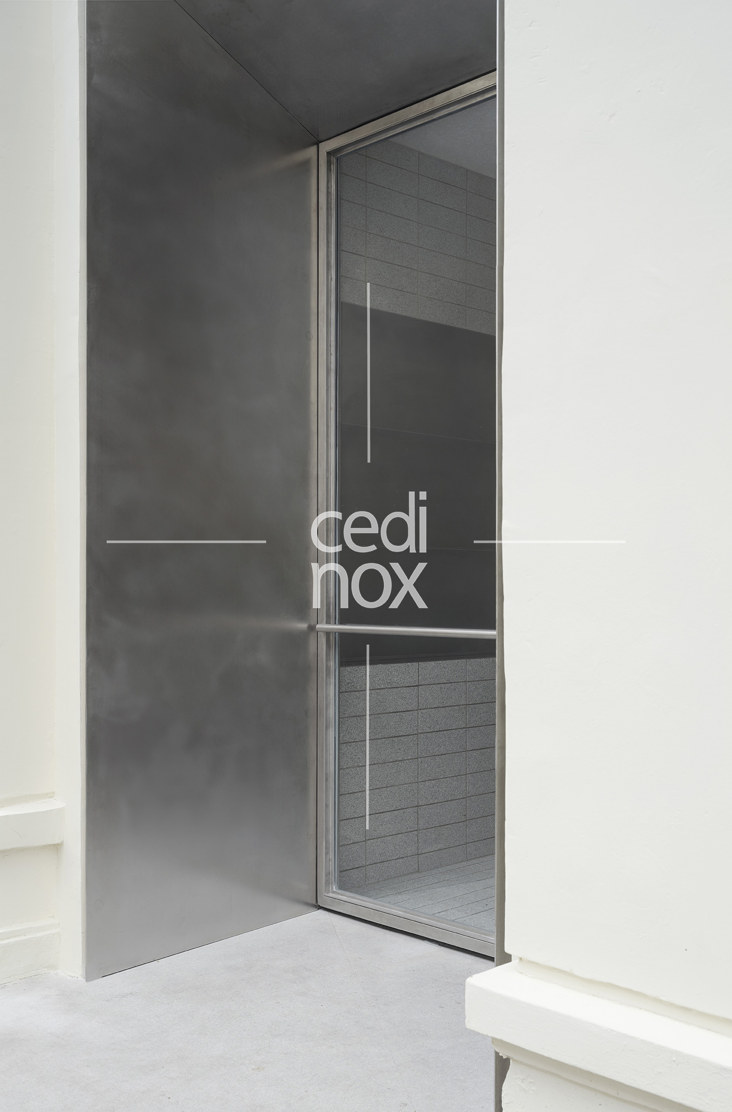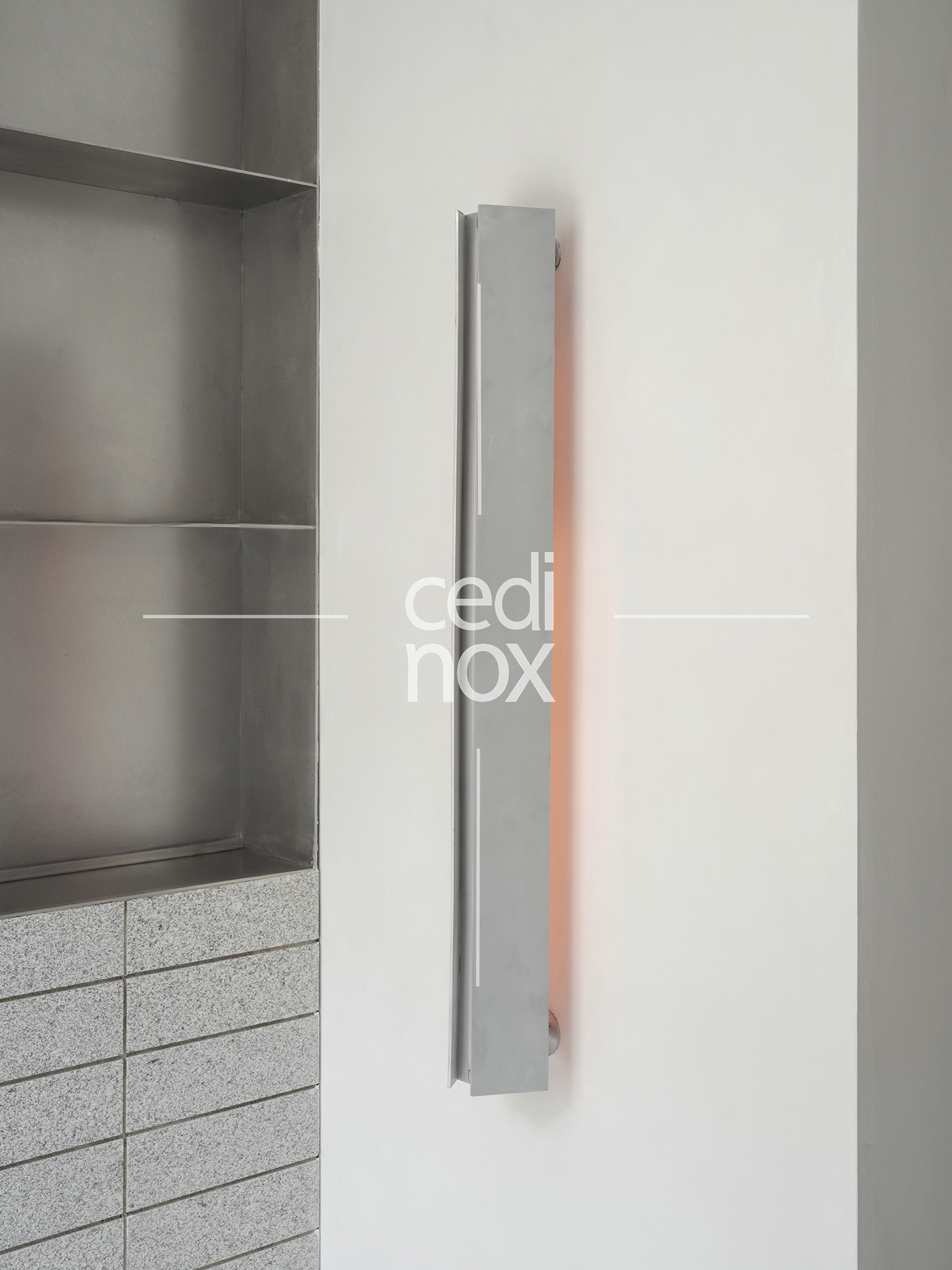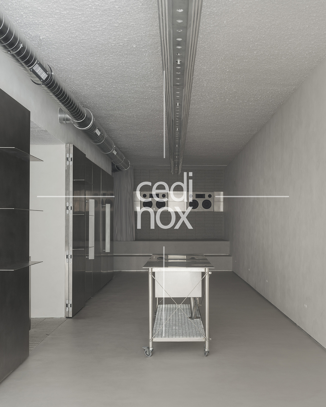 El acero inoxidable tiene una gran responsabilidad, además de darnos el acceso a través de la monumental puerta, es el mecanismo que activa la versatilidad del proyecto. Se manifiesta a través del imponente revestimiento metálico que domina uno de los flancos de la sala. Este plano continuo no es sólo un acabado estético de gran potencia visual; es una superficie móvil que custodia el programa funcional, la cocina y espacio de preparación. Los paneles están formados por tablero de DM revestido con acero inoxidable en acabado vibrado de 1,5 mm de espesor.
