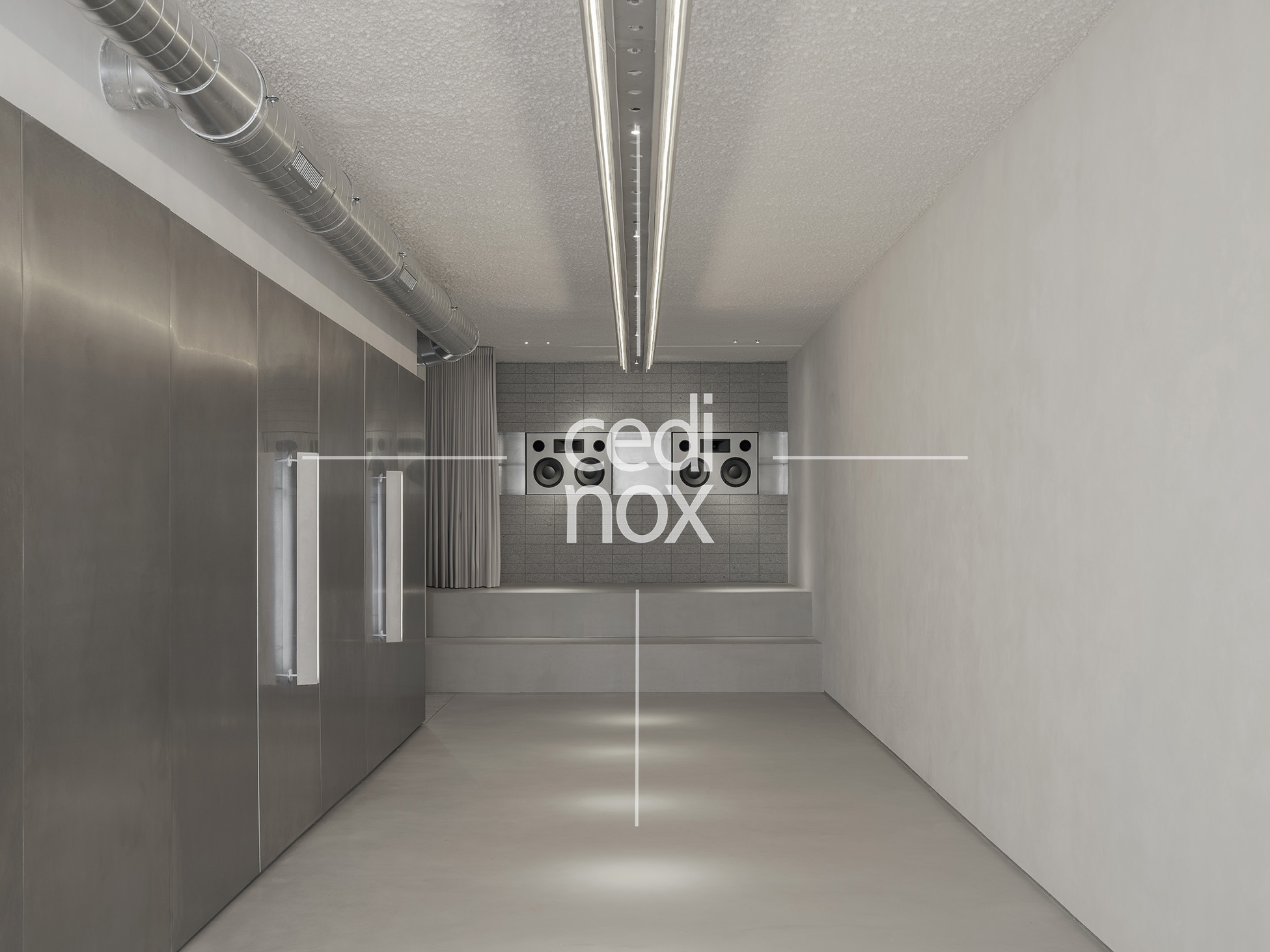 El proyecto se descubre a través de una secuencia de transiciones materiales: desde la monumental puerta de entrada en acero inoxidable —un gesto rotundo y masivo— hasta un vestíbulo pétreo de granito que funciona como pausa previa a la gran nave central. En este núcleo diáfano, el diseño juega con la dualidad entre lo visto y lo oculto; un anfiteatro versátil y una escenografía técnica que se oculta tras textiles, permitiendo que el espacio se transforme en una plataforma colaborativa en tonos neutros y exquisitamente detallada.